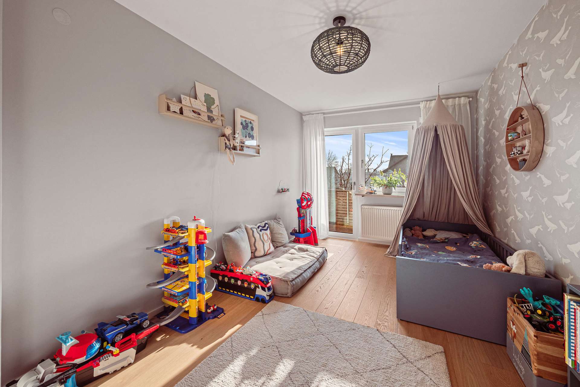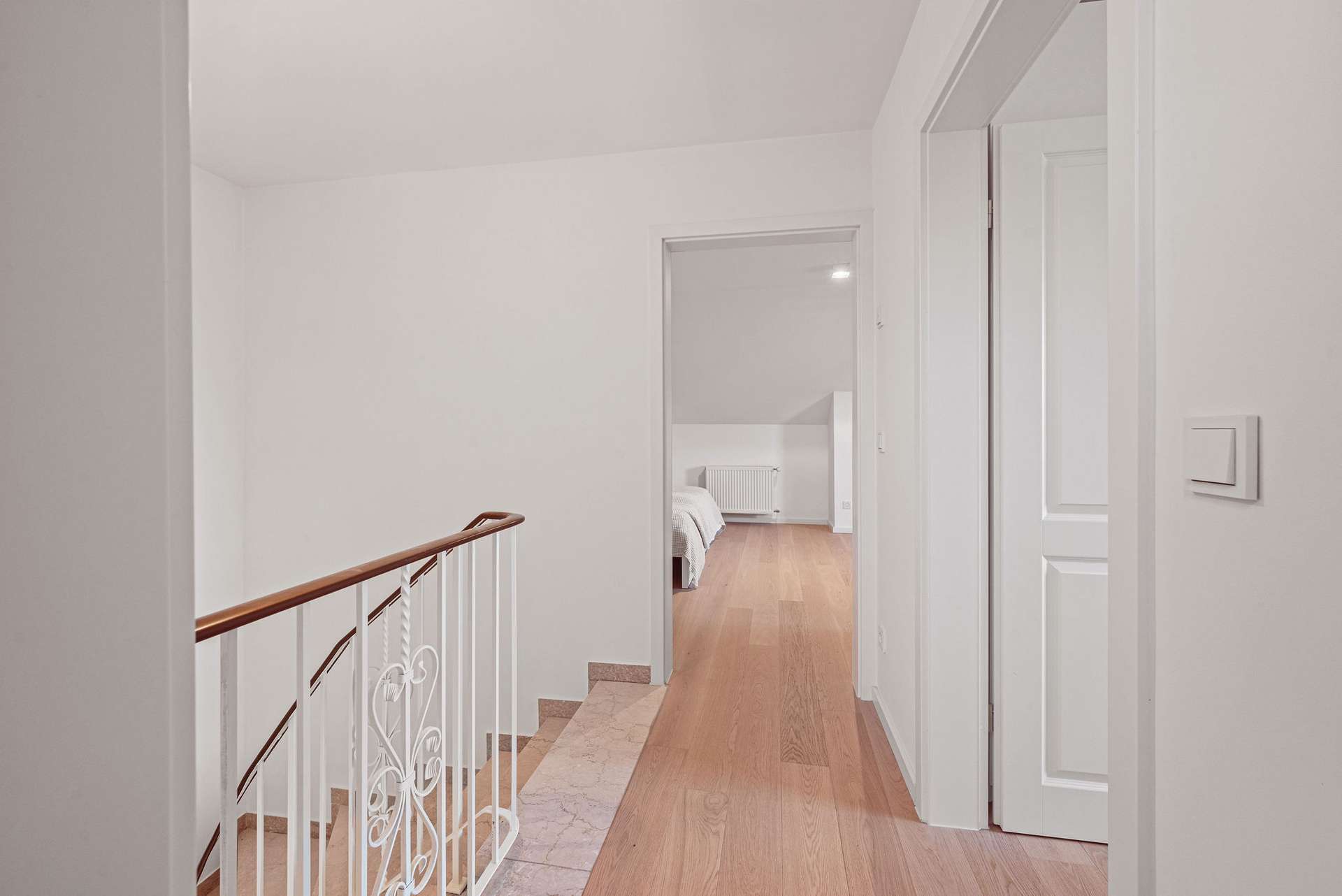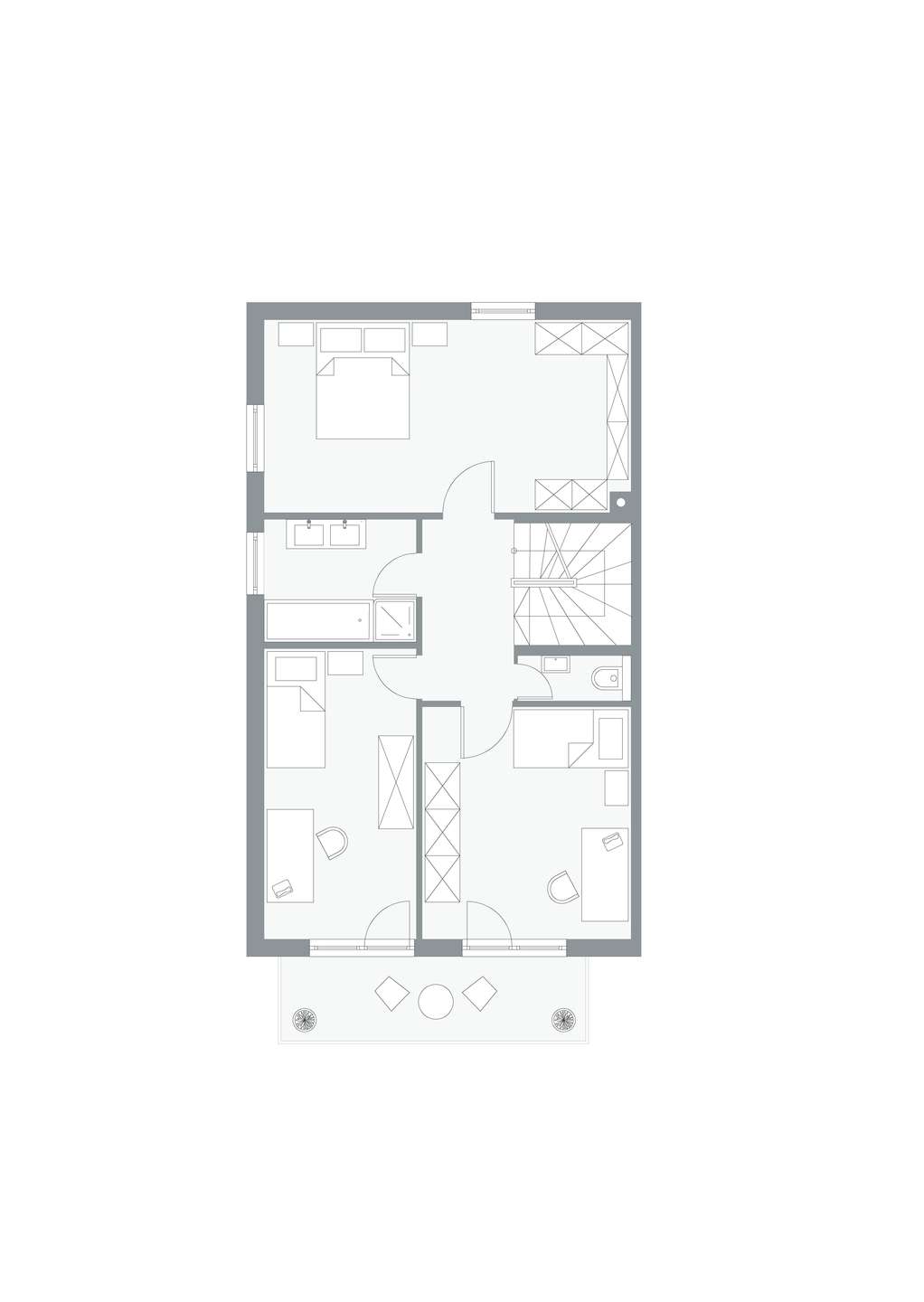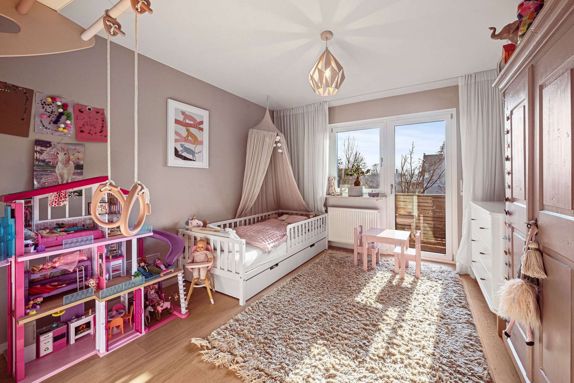 Im Obergeschoss befinden sich ein großzügiges Elternschlafzimmer, zwei Kinderzimmer und ein Tageslichtbadezimmer. Dieses ist mit einer modernen Dusche, Badewanne sowie mit einem Doppelwaschbecken ausgestattet. Besonders praktisch ist das separate WC auf der Etage.