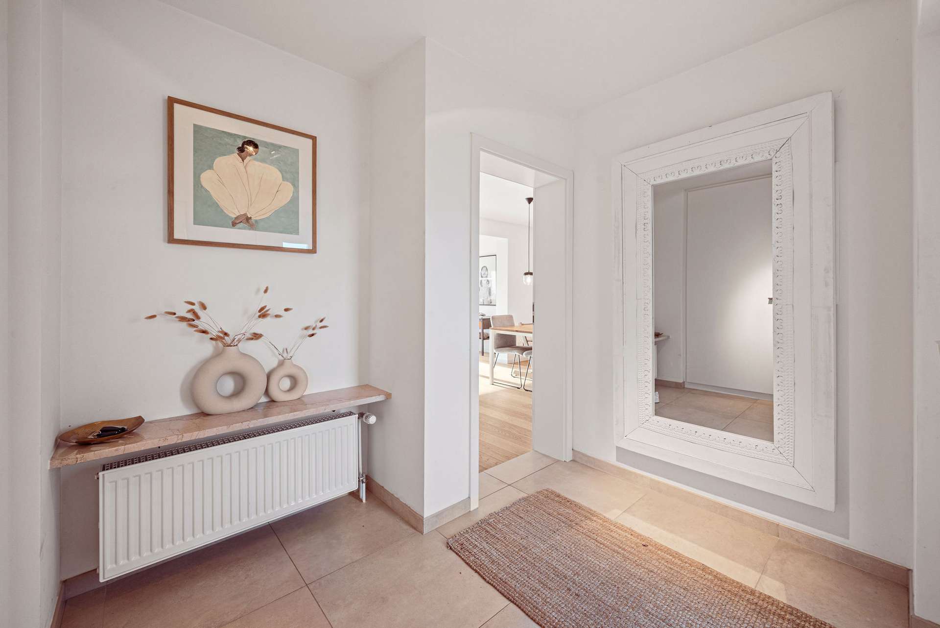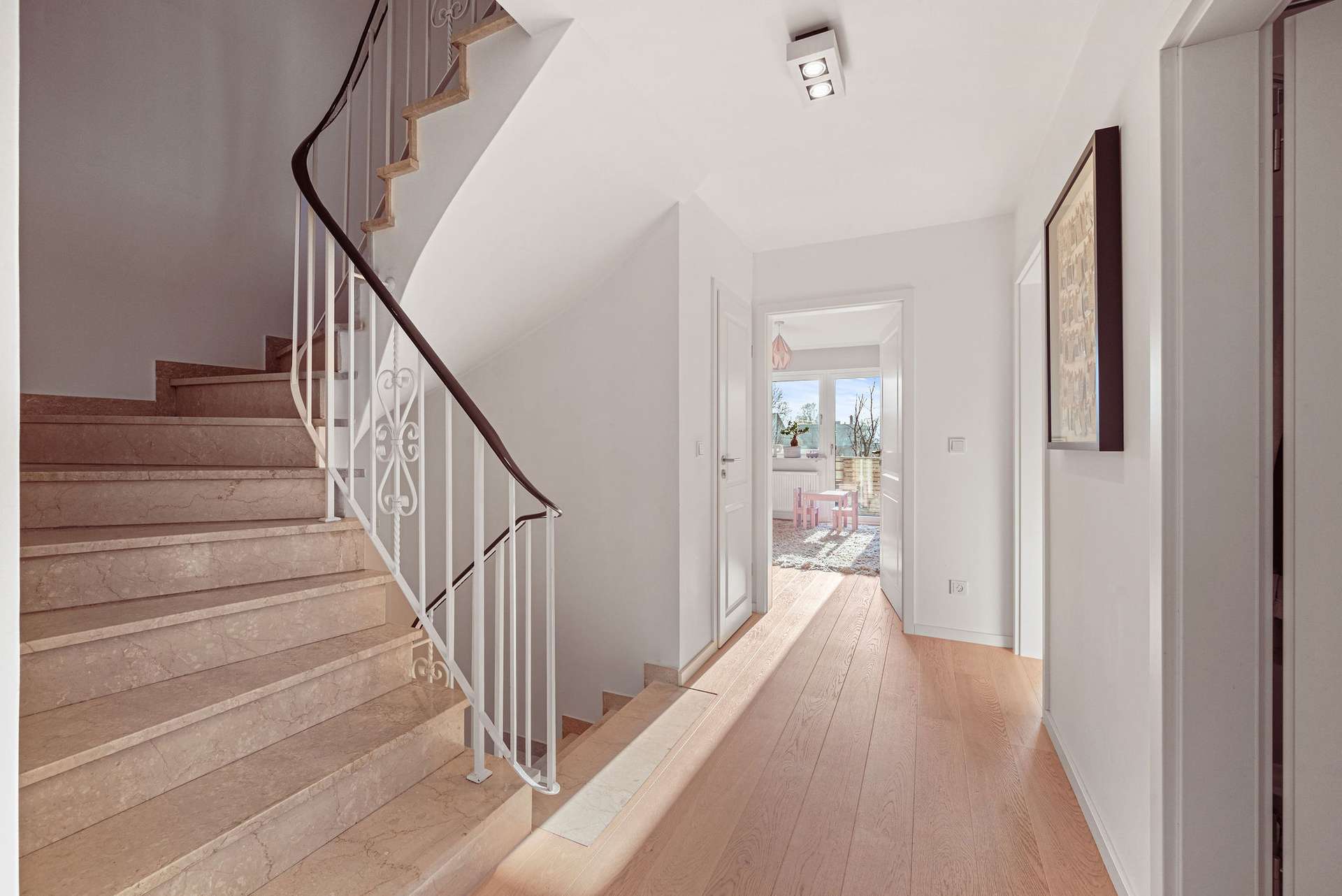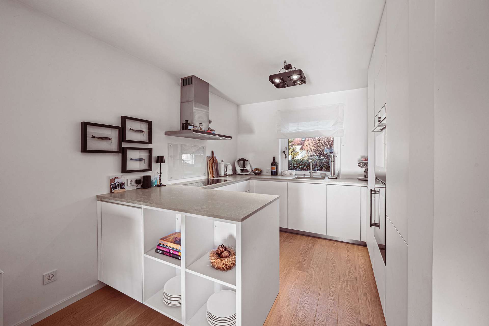 Nach dem Betreten befinden Sie sich in einer hellen Diele mit Zugang zum Gäste-WC. Diese ist mit einem hochwertigen Schreiner-Einbauschrank ausgestattet. Unmittelbar daran grenzt die offene und voll ausgestattete Küche mit hochwertigen Markeneinbaugeräten von Siemens und Miele.