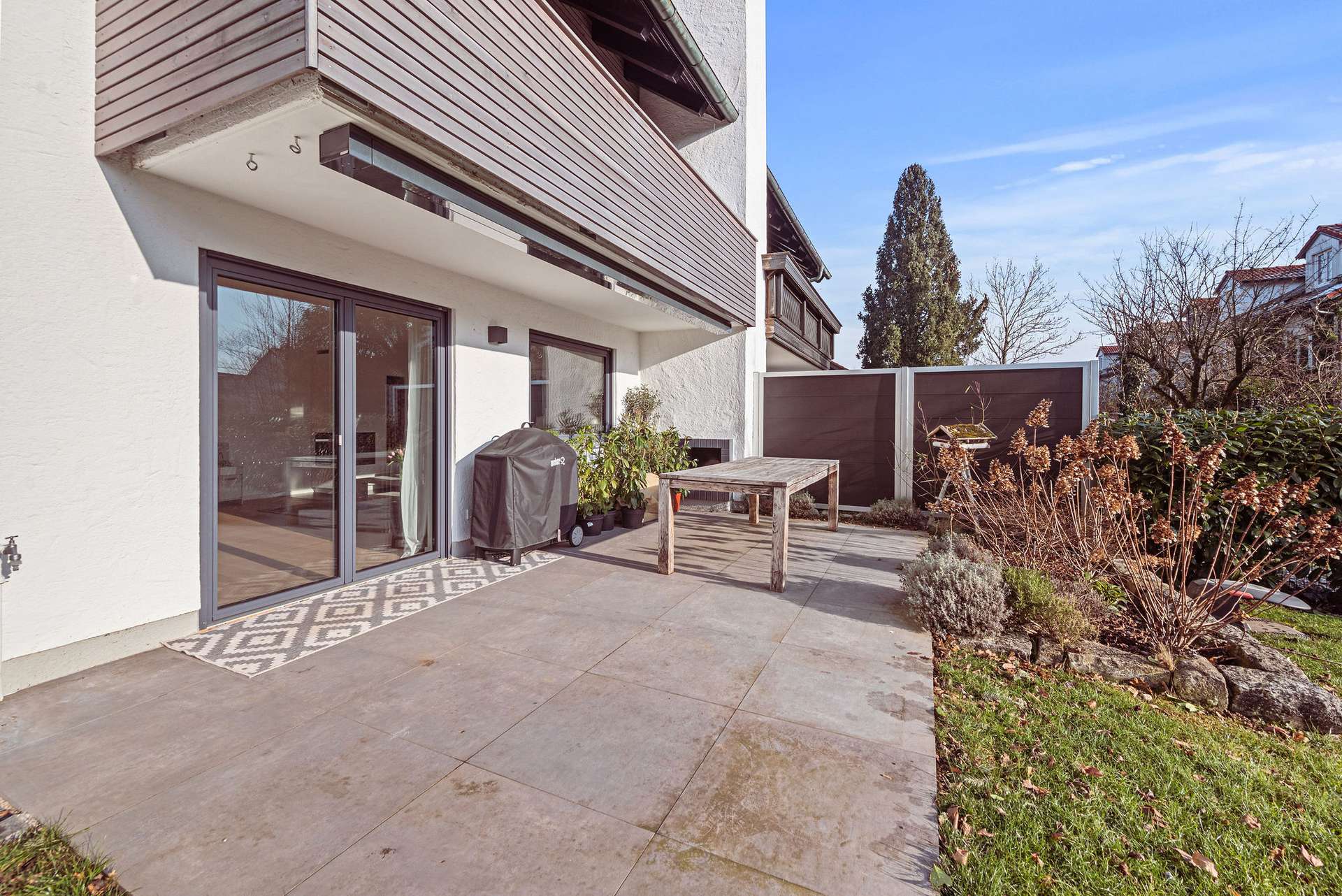 Über das Wohnzimmer gelangen Sie auch auf die Süd-Terrasse, welche über einen eigenen Außenkamin verfügt und anschließend in einen ca. 150 m² großen, pflegeleichten Garten übergeht.