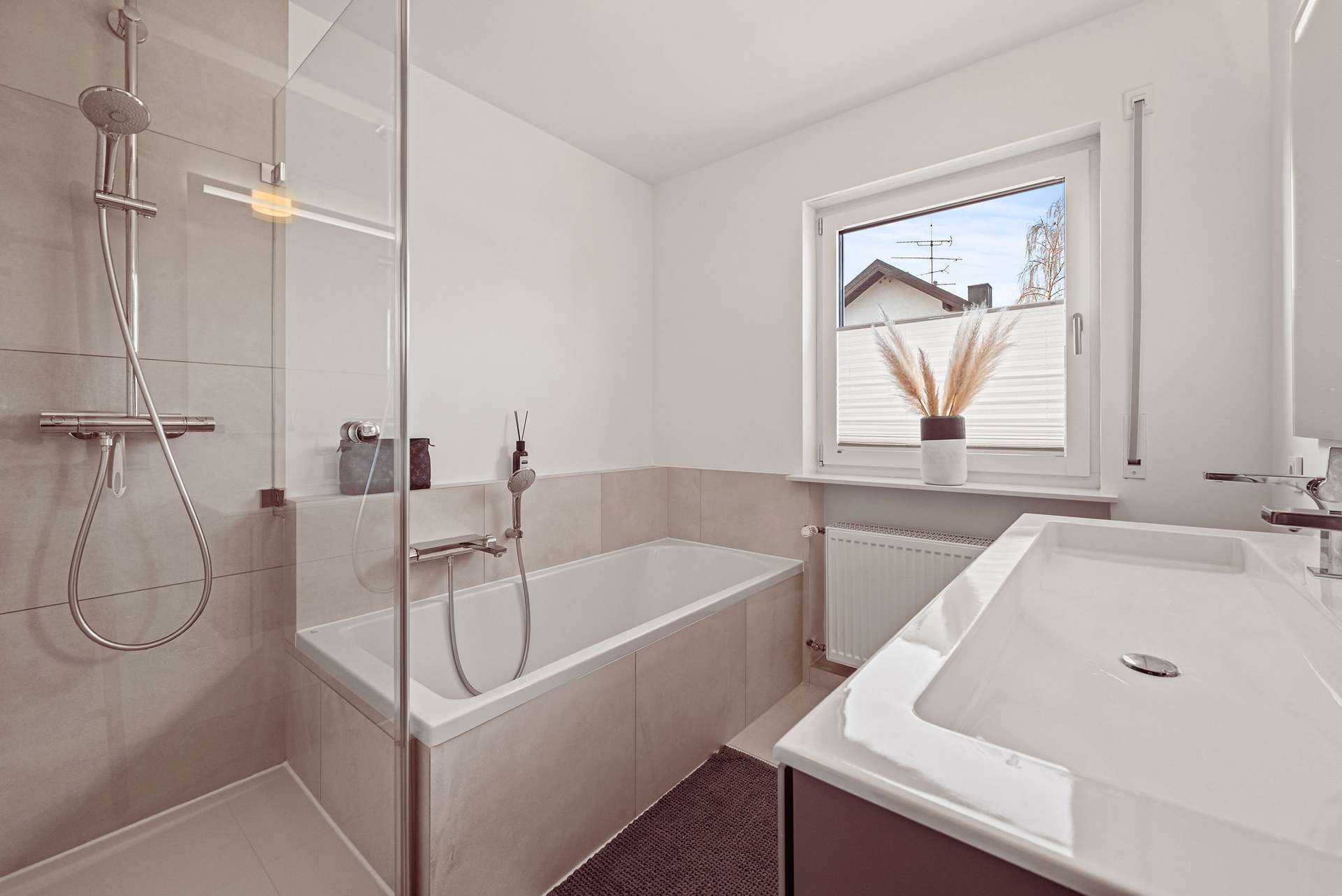 - + Tageslichtbadezimmer mit Dusche, Badewanne und Doppelwaschbecken (Keuco)