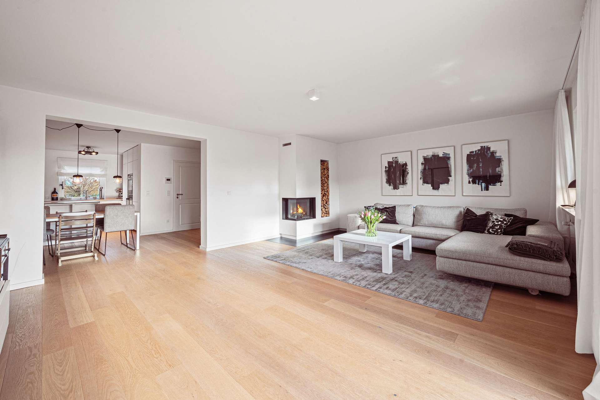 Highlight des Erdgeschosses ist die offene Grundrissaufteilung. Die Küche mit angrenzendem Essbereich geht fließend in das große Wohnzimmer über. Der moderne Kamin lädt Sie und Ihre Familie zu gemütlichen Abenden vor dem Feuer ein.