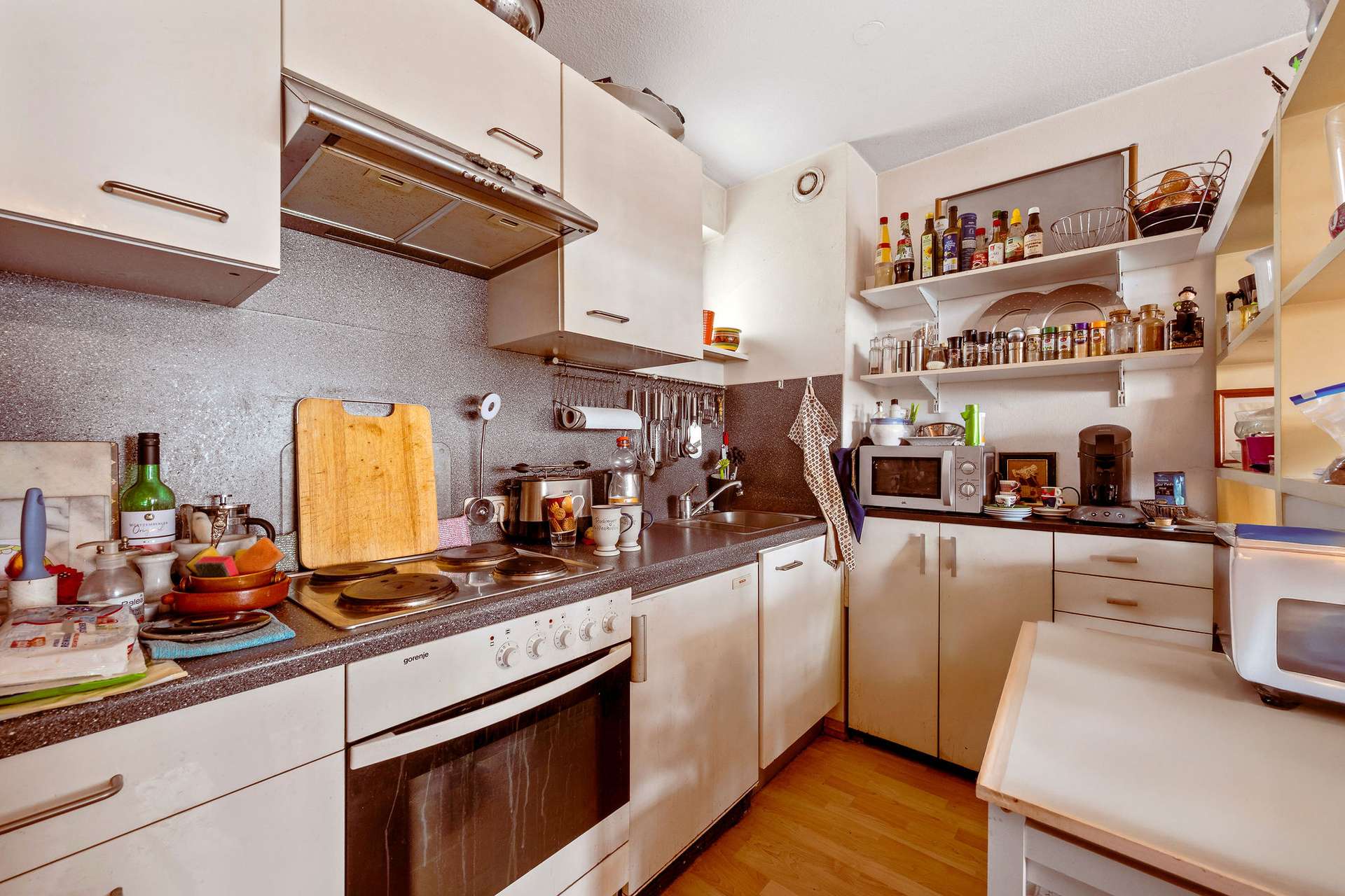 Das Wohnzimmer bietet Zugang zum Schlafzimmer sowie zu einem ca. 12 m² großen Balkon mit Westausrichtung, der ebenfalls direkt vom Schlafzimmer aus begehbar ist. Vom Wohnzimmer aus ist die Küche offen angebunden und schafft eine kommunikative Atmosphäre, was ideal für gemeinsames Kochen und gesellige Abende ist.