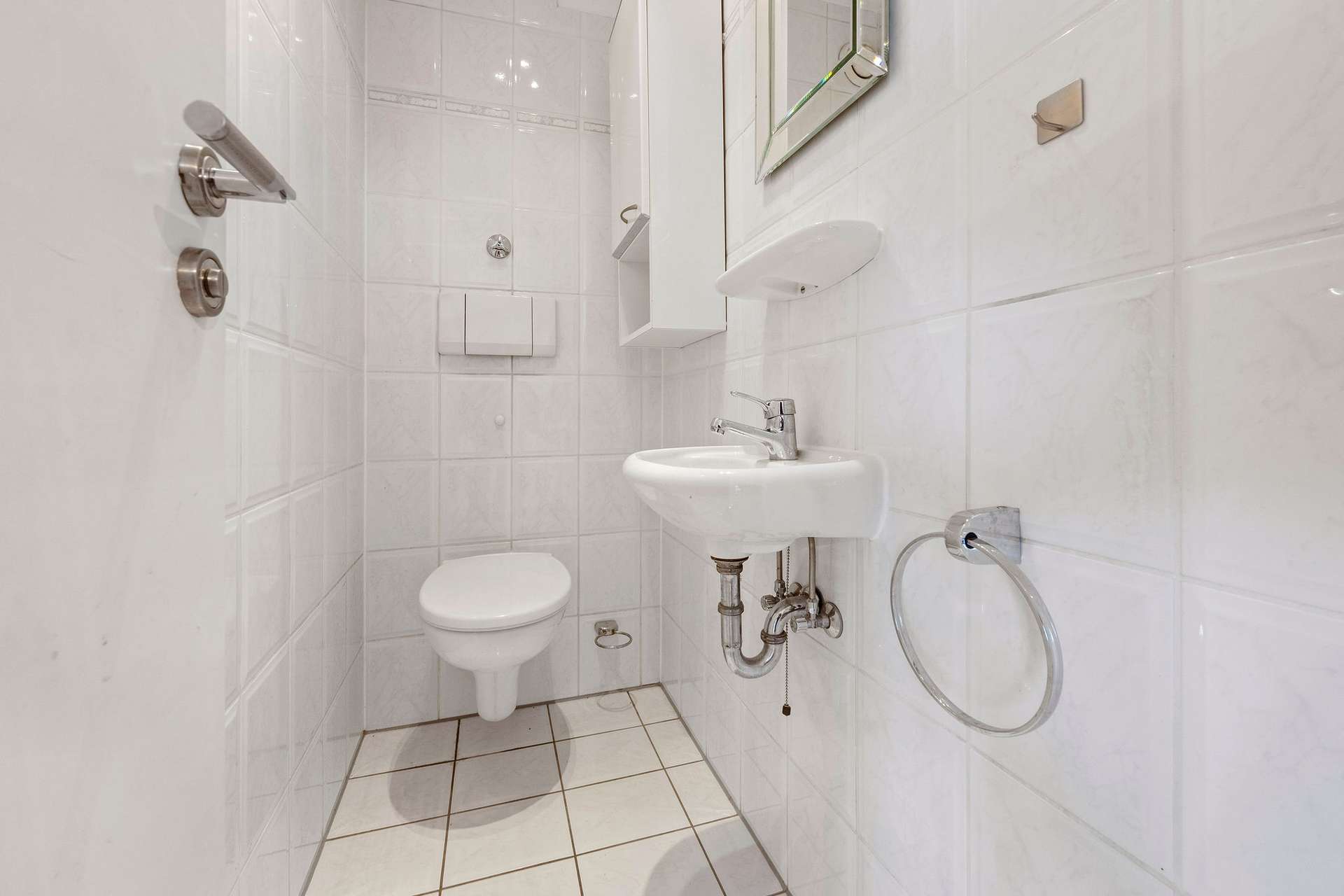 Zu Ihrer Linken befindet sich das Gäste-WC, welches an das innenliegende Badezimmer angrenzt. Es ist mit einer Duschwanne, Einzelwaschbecken, Handtuchheizkörper und Waschmaschinenanschluss ausgestattet.